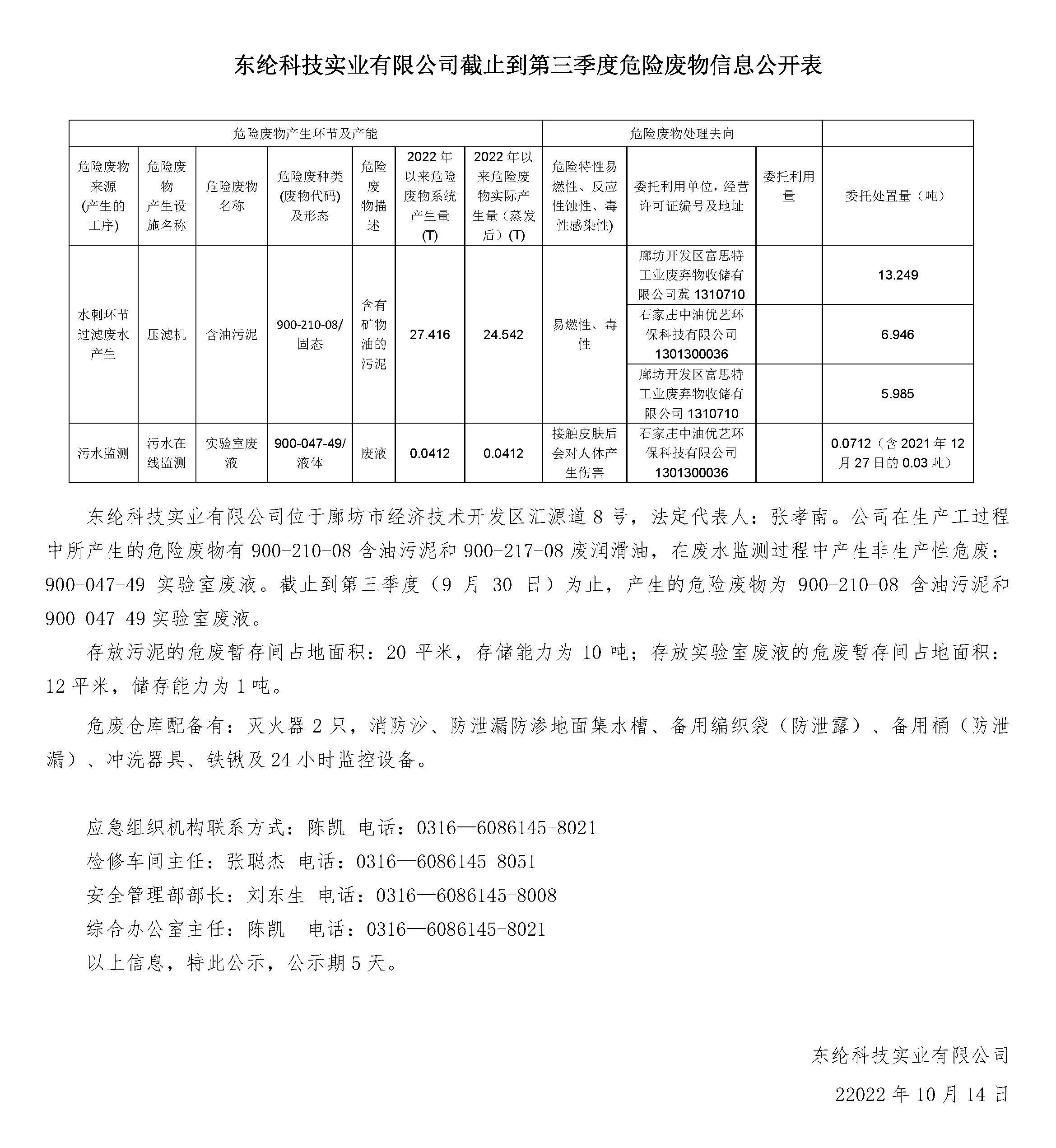 東綸科技實業有限公司位于廊坊市經濟技術開發區匯源道8號,法定代表人:張孝南。公司在生產工過程中所產生的危險廢物有900-210-08含油污泥和900-217-08廢潤滑油,在廢水監測過程中產生非生產性危廢:900-047-4