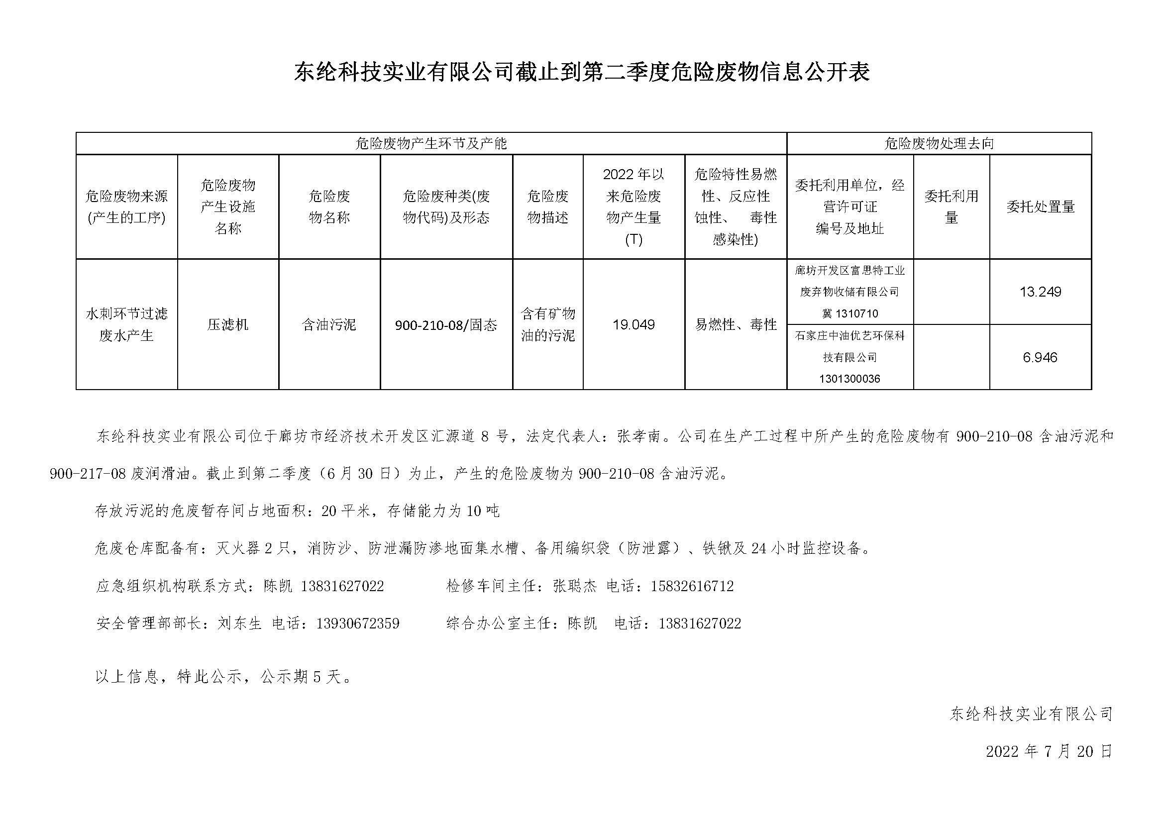 東綸科技實(shí)業(yè)有限公司位于廊坊市經(jīng)濟(jì)技術(shù)開發(fā)區(qū)匯源道8號(hào),法定代表人:張孝南。公司在生產(chǎn)工過程中所產(chǎn)生的危險(xiǎn)廢物有900-210-08含油污泥和900-217-08廢潤(rùn)滑油。截止到第二季度(6月30日)為止,產(chǎn)生的危險(xiǎn)廢物為90